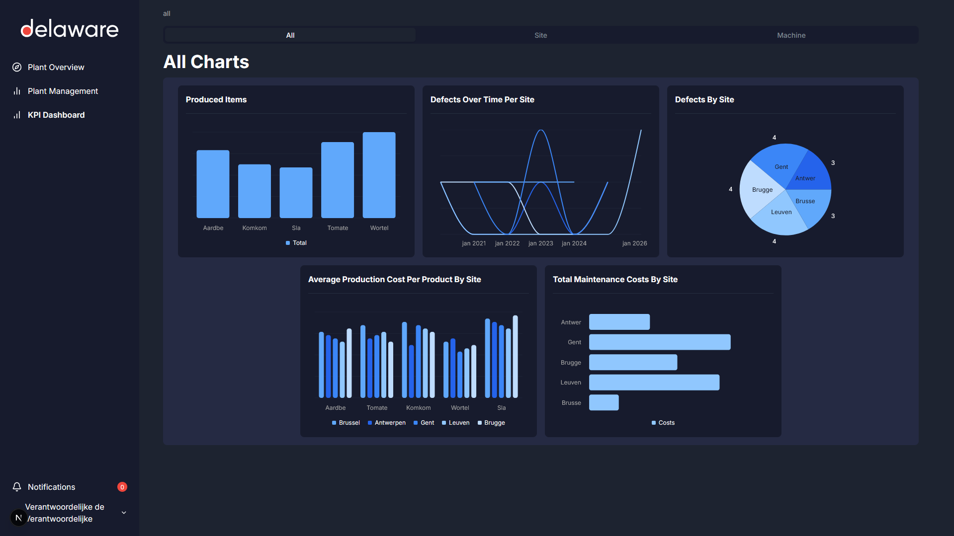 A management/information platform where metrics or statuses on production facilities and their machines could be consulted, created for the company Delaware as a proof of concept.